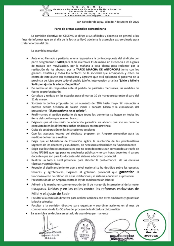 El gremio que agrupa a los docentes del nivel secundario y superior (CEDEMS), anunció un paro de 24 horas con movilización para el miércoles 11 de marzo en toda la provincia. En Asamblea Extraordinaria, los afiliados y afiliadas resolvieron convocar a la medida de fuerza que, incluye una marcha de antorchas, en respuesta a la falta de convocatoria a paritarias.