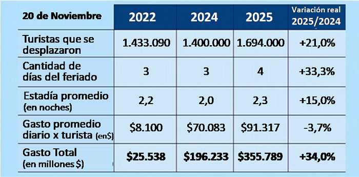 De acuerdo con el relevamiento de la Confederación Argentina de la Mediana Empresa (CAME), durante el fin de semana por el Día de la Soberanía Nacional se desplazaron 1.694.000 turistas por la Argentina, un 21% más que en el mismo feriado de 2024. El crecimiento se vio favorecido por la combinación de un clima templado, una agenda nacional muy activa y el formato de cuatro días, que amplió las posibilidades de viaje.