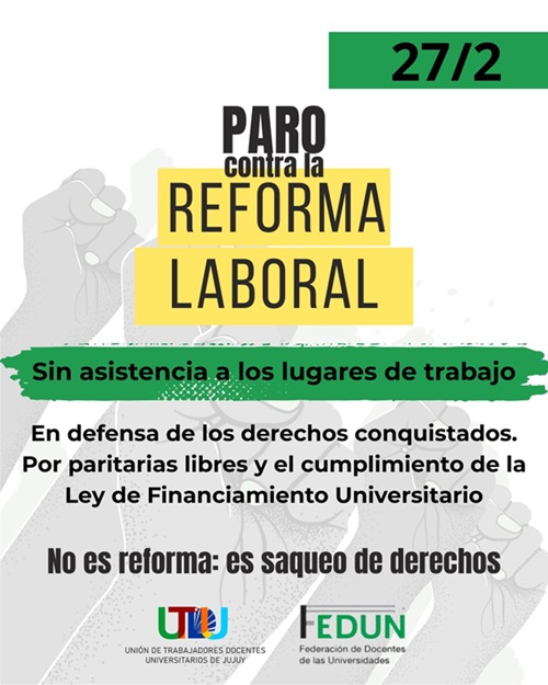 En tanto, la Unión de Trabajadores Docentes Universitarios de Jujuy (UTDUJ) anunció su adhesión al paro convocado para este viernes 27 de febrero, sin asistencia a los lugares de trabajo, en rechazo a la reforma laboral. Desde el gremio manifestaron que la medida se realiza en defensa de los derechos conquistados, por paritarias libres y por el cumplimiento efectivo de la Ley de Financiamiento Universitario. “No es una reforma, sino un saqueo de derechos”, y remarcaron la necesidad de sostener la unidad del sector docente frente a medidas que, según señalaron, vulneran derechos constitucionales de trabajadores y trabajadoras universitarias.