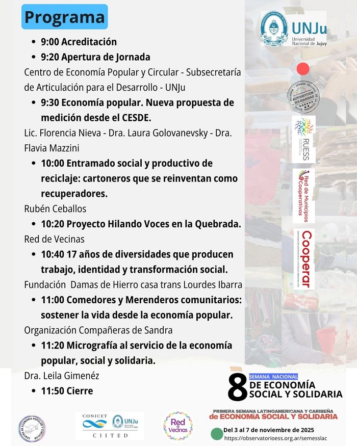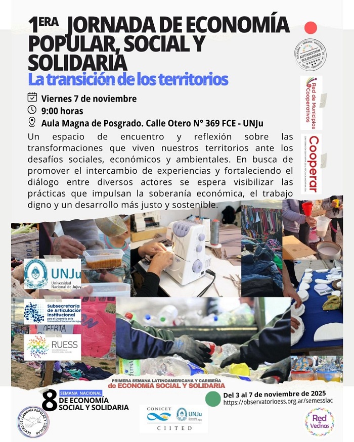 El viernes 7 de noviembre desde las 9:00 en la Facultad de Ciencias Económicas de la Universidad Nacional de Jujuy, se realizará la 1° Jornada de Economía Popular, Social y Solidaria organizada por el Centro Interdisciplinario de Investigaciones en Tecnologías y Desarrollo Social para el NOA, CIITeD-UNJu.