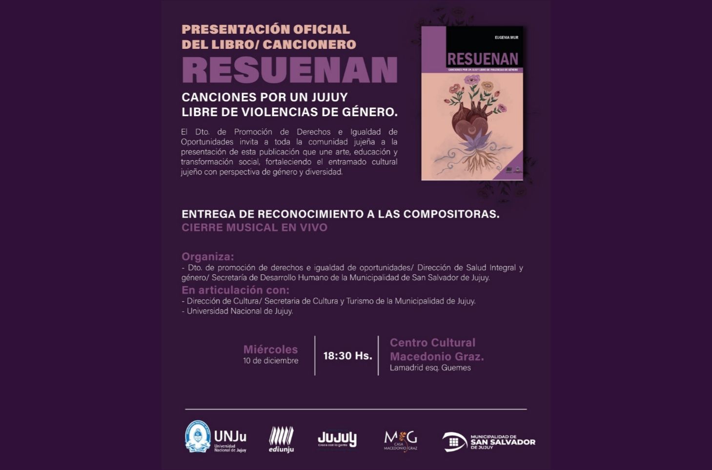 Se presentará oficialmente el libro-cancionero “Resuenan. Canciones por un Jujuy libre de violencias de género”, una obra creada para abordar la igualdad, la diversidad y los derechos desde la música y la educación. El material será presentado el miércoles 10 de diciembre, a las 18:30 horas, en el Centro Cultural Macedonio Graz, en el marco del Día de los Derechos Humanos.