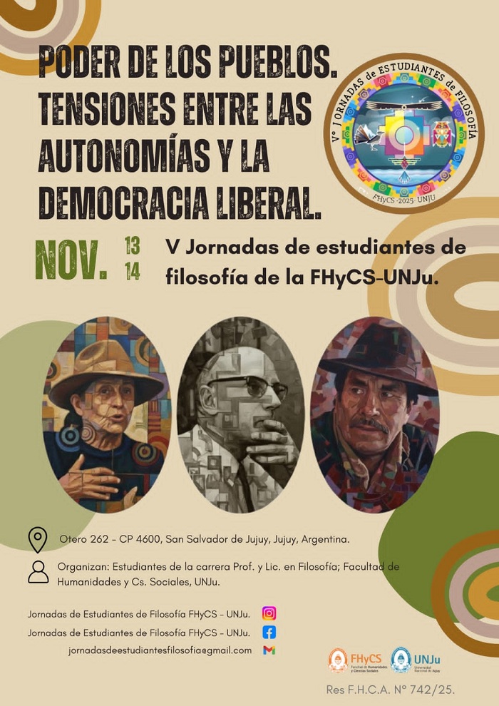 Los días 13 y 14 de noviembre se realizarán las V Jornadas de Estudiantes de Filosofía de la Facultad de Humanidades y Ciencias Sociales de la Universidad Nacional de Jujuy denominadas el “Poder de los Pueblos. Tensiones entre las Autonomías y la Democracia Liberal”.