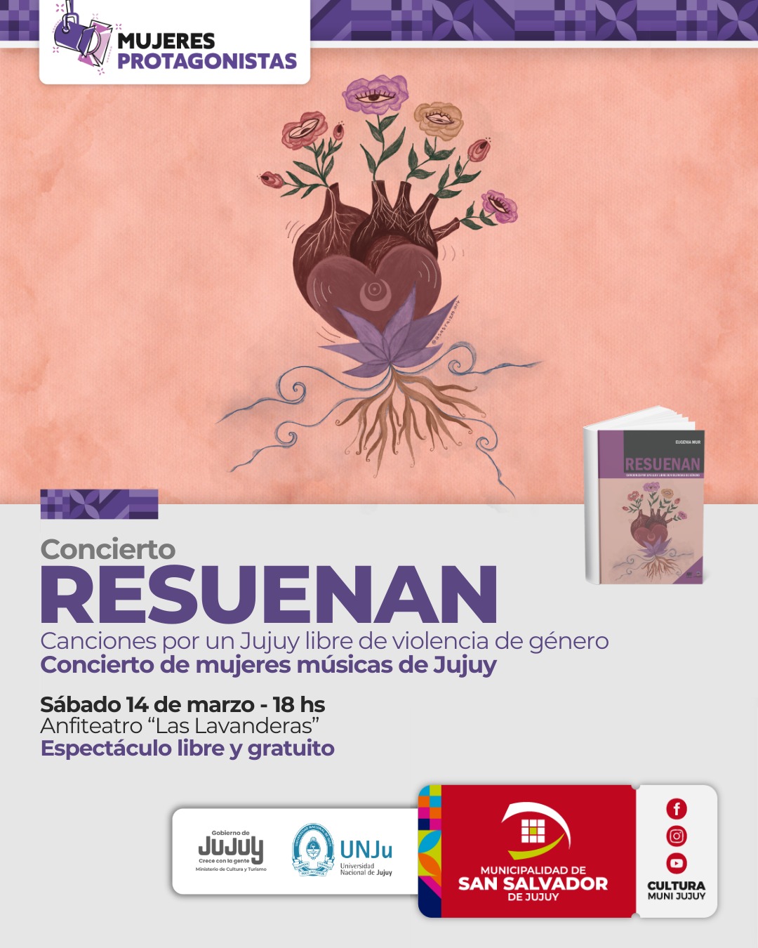 En el marco del Día Internacional de la Mujer, toda la comunidad está invitada a participar del Concierto "Resuenan", una propuesta artística que surge del libro cancionero Resuenan: Canciones por un Jujuy libre de violencias construido colectivamente por mujeres.
