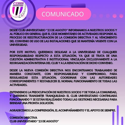 Ante las consultas de socios, socias y de la comunidad en general, el Club Universitario “23 de Agosto” informó que se encuentra en un cese de actividades momentáneo que responde exclusivamente a una situación administrativa interna.