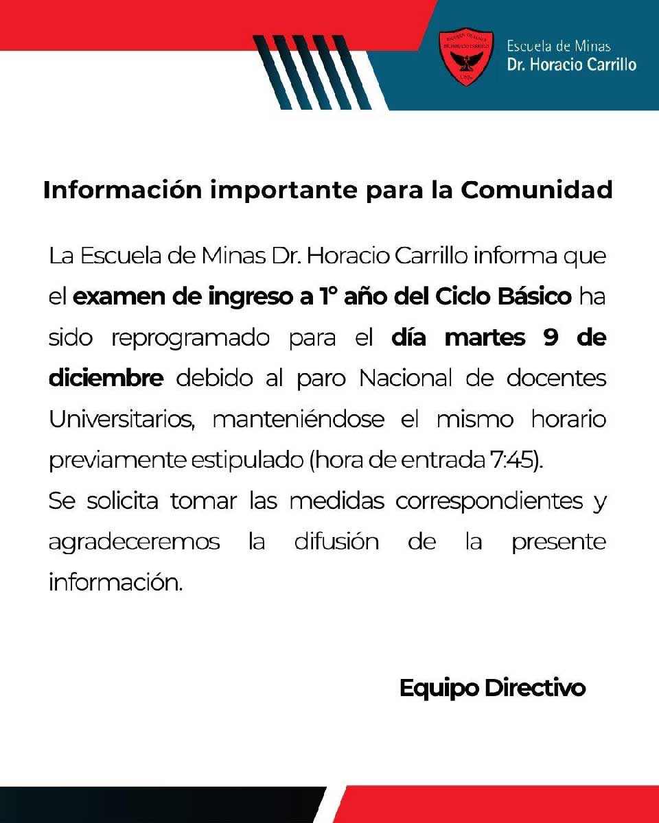Mediante un comunicado, la Escuela de Minas "Dr. Horacio Carrillo" UNJu confirmó que el examen de ingreso a 1er. año del Ciclo Básico ha sido reprogramado para el día martes 9 de diciembre debido al paro Nacional de docentes Universitarios, manteniendo el horario previamente estipulado, la hora de entrada sería a las 7:45.