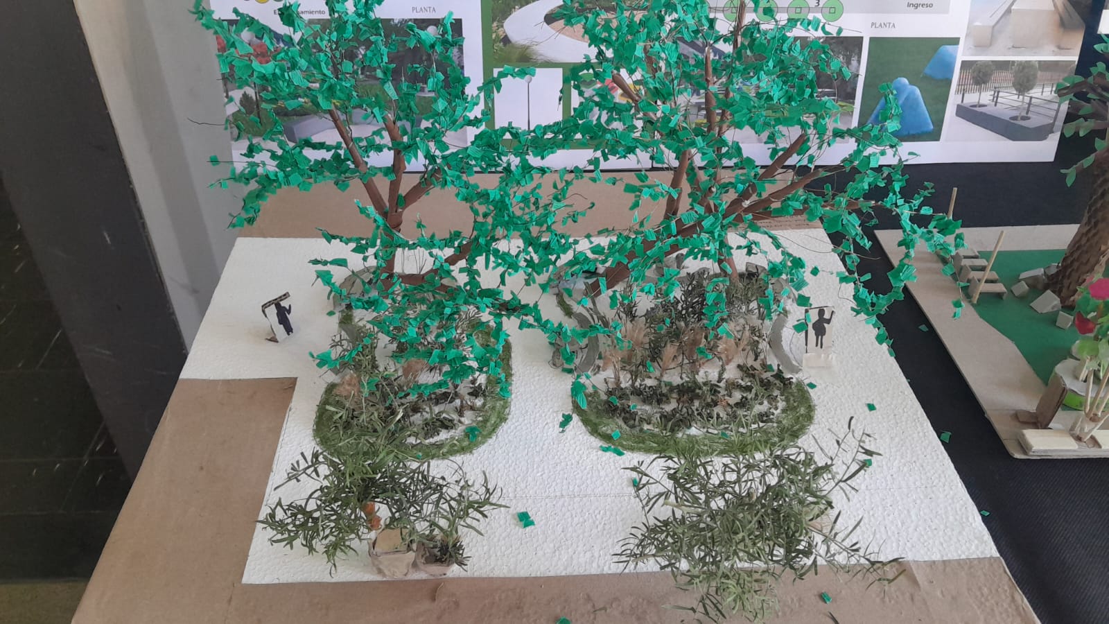 Proyecto 3: propone reemplazar el olmo siberiano por un árbol autóctono y mantener la circulación principal y agregar circulaciones secundarias más sectores de permanencia y contemplación. Además, la creación de nuevas caminerías con bancos de madera y una fuente. En otro sector, una larga mesa con bancos para estudiar o comer.