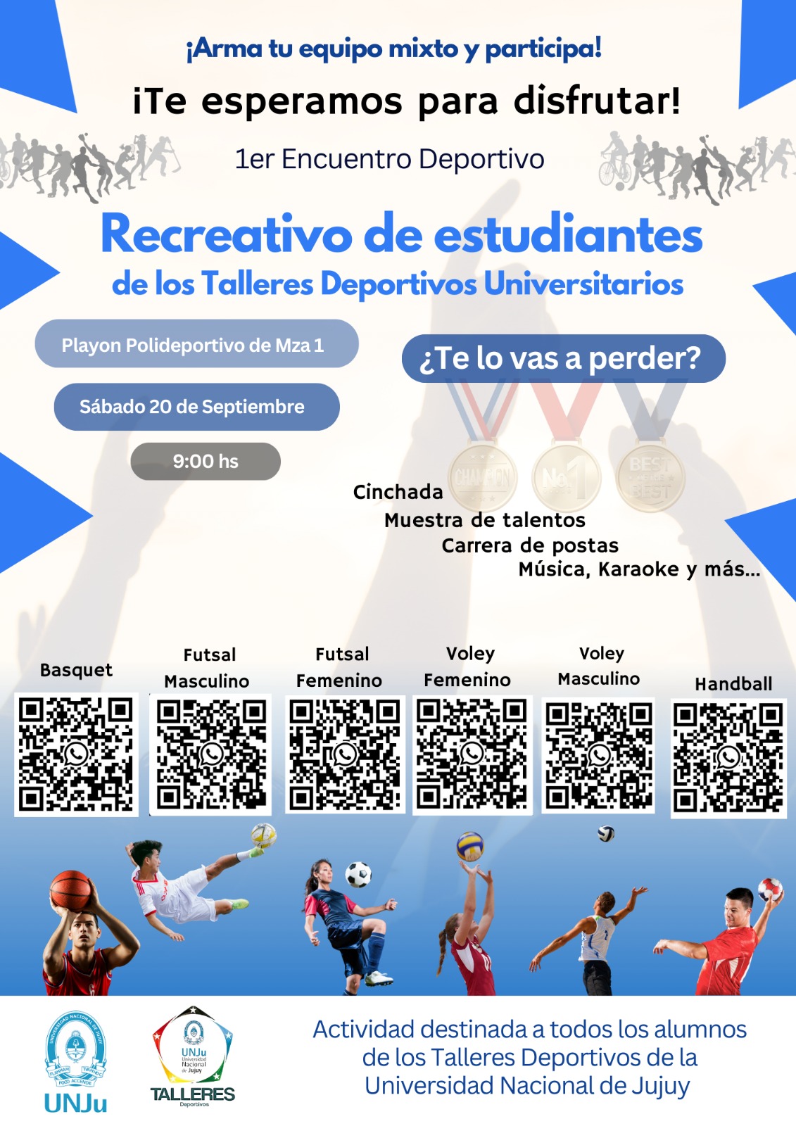 Invitan a participar del 1°Encuentro Deportivo Recreativo, de los Talleres Deportivos de la UNJu, que se desarrollará el próximo sábado 20 de septiembre en el Playón Polideportivo de la Escuela de Minas.
