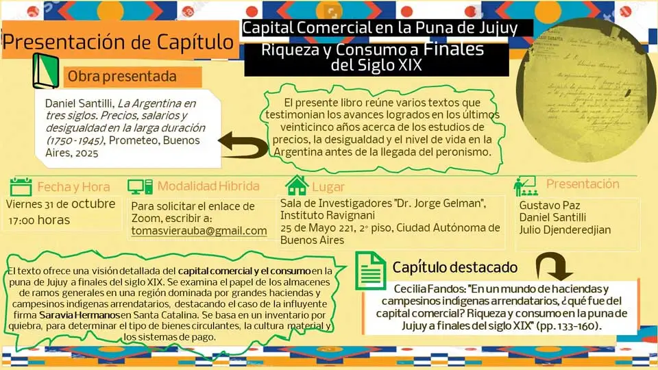 En la provincia de Jujuy la Doctora en Historia, Cecilia Fandos, docente e investigadora del Conicet, desarrolló el capítulo: “En un mundo de haciendas y campesinos indígenas arrendatarios, ¿qué fue del capital comercial?. Riqueza y consumo en la Puna de Jujuy a finales del siglo XIX”.
