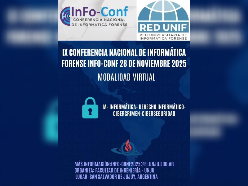 El viernes 28 de noviembre de 2025 la Facultad de Ingeniería, de la Universidad Nacional de Jujuy dará inicio a la IX Conferencia Nacional de Informática Forense. La misma fue declarada de Interés Institucional por la Honorable Suprema Corte de Justicia de la Provincia de Buenos Aires.