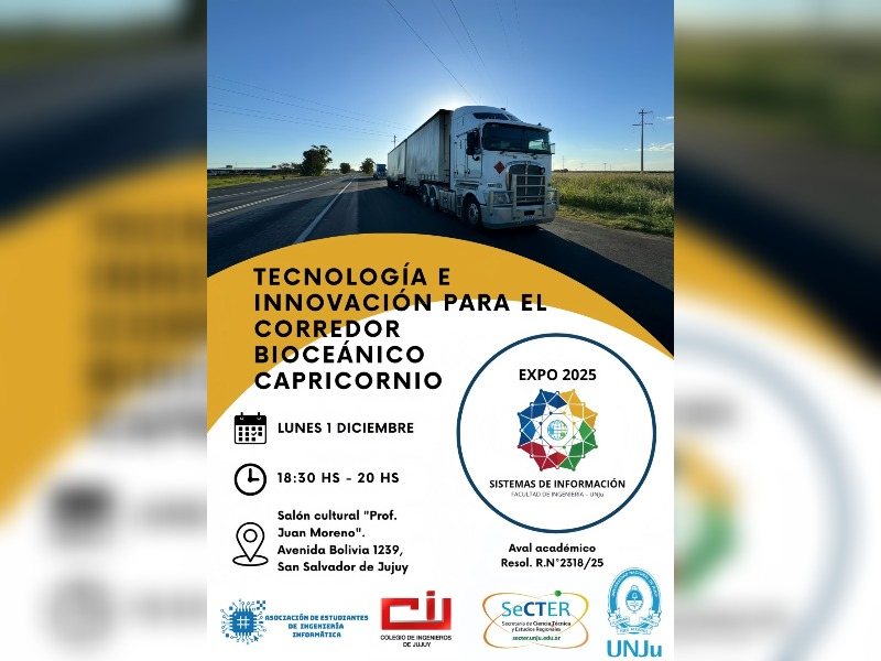 La cátedra de Sistemas de Información de las carreras de Ingeniería Industrial e Ingeniería Informática de la Facultad de Ingeniería, es la que organiza la exposición “Tecnología e innovación para el corredor Bioceánico Capricornio”, para el día lunes 1 de diciembre, desde las 18:30 horas, en el salón cultural profesor Juan Moreno, en avenida Bolivia 1239.