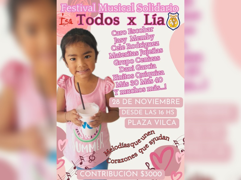 El próximo viernes 28 la comunidad educativa del Instituto Superior de Música realizará el festival solidario “Todos por Lía”, a partir de las 16 horas en la Plaza Ricardo Vilca, con un costo de la entrada de tres mil pesos.