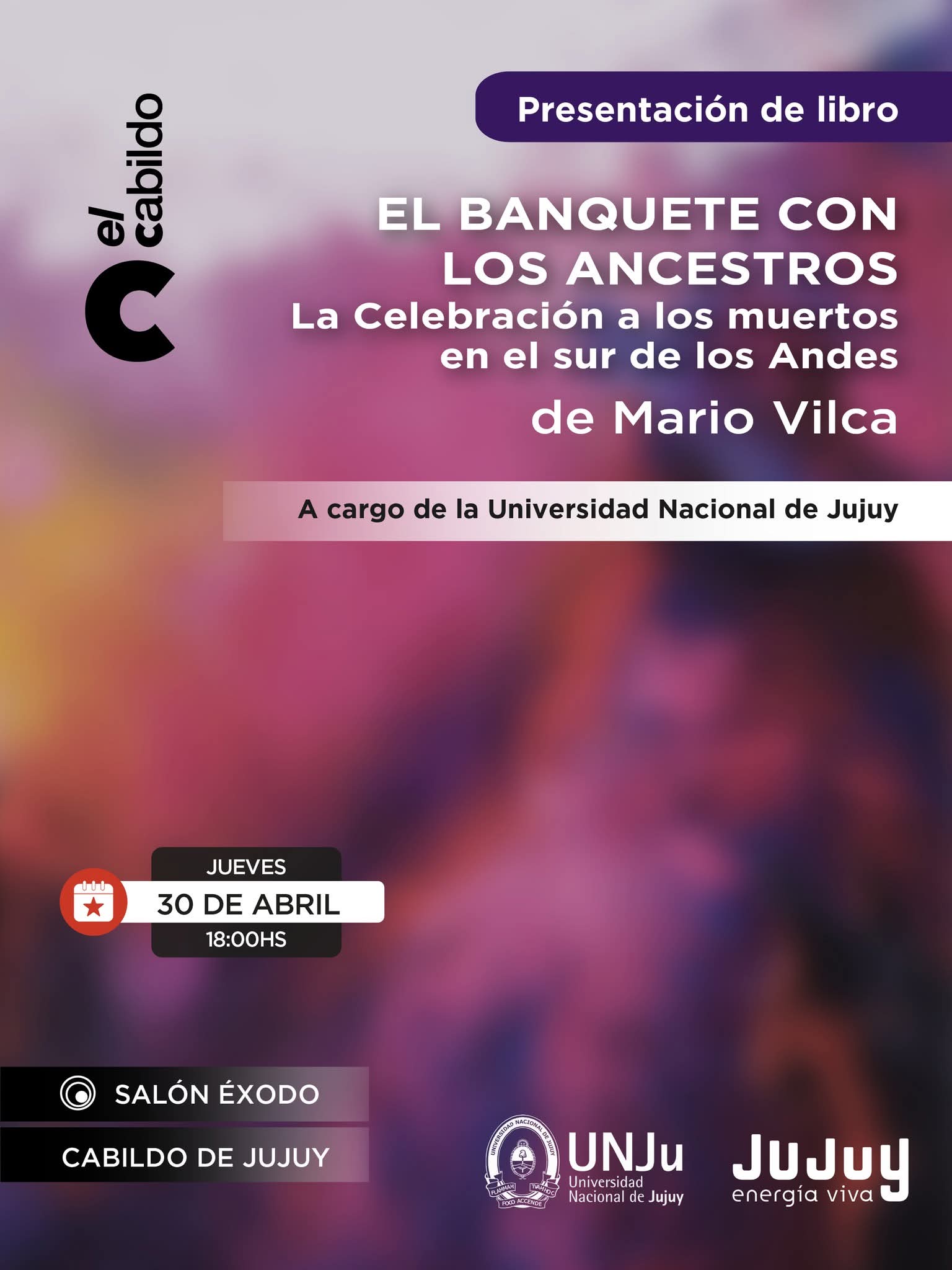 El jueves 30 de abril a las 18:00 horas en el Salón Éxodo del Cabildo de Jujuy, se llevará a cabo la presentación del libro “El banquete con los ancestros”, de Mario Vilca, doctor en Filosofía y profesor adjunto en las cátedras de Pensamiento y Cultura Andino y Antropología en la UNJu.