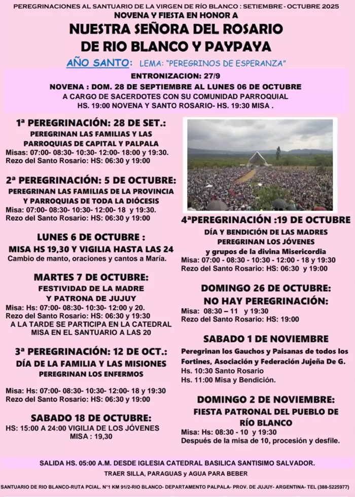 Hoy domingo 5 de octubre, bajo el lema "Peregrinos de Esperanza", se realiza la segunda peregrinación al Santuario de Rio Blanco y Paypaya. Una rica tradición que no solo perdura en el tiempo sino que cada año suma mas fieles. Una demostración de devoción y fe que caracteriza al mes de octubre.