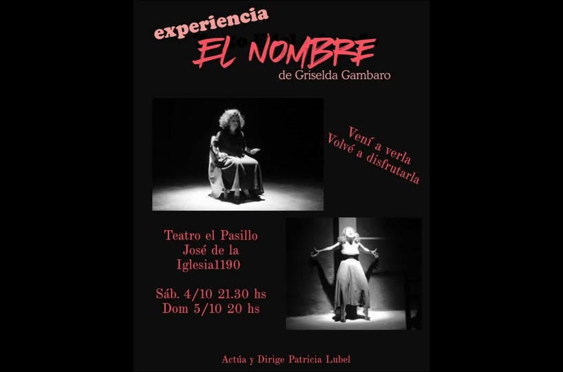 Este fin de semana, el Teatro El Pasillo será escenario del reestreno de “Experiencia El Nombre”, de Griselda Gambaro, una obra emblemática que cuestiona la pérdida de identidad como forma de sometimiento social y político. Con funciones el sábado 4 de octubre a las 21:30 horas y el domingo 5 a las 20:00 horas, la puesta cuenta con la actuación y dirección de Patricia Lubel y la asistencia de dirección de Casandra Balderacchi.