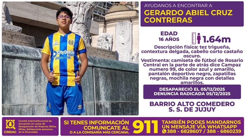 Se trata de Gerardo Abiel Cruz Contreras de 16 años domiciliado en barrio Alto Comedero. Se encuentra desaparecido desde el viernes 5 de diciembre. La denuncia se radicó el mismo día. El Comité Interinstitucional de Actuación en Casos de Desaparición de Mujeres, Niñas y Personas de la Diversidad (CINDAC) pide colaboración a la comunidad para dar con su paradero.