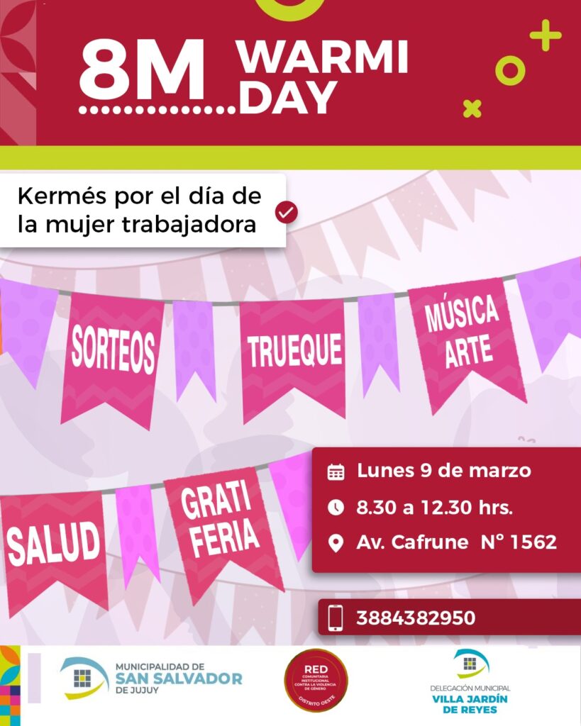 La Municipalidad de San Salvador de Jujuy invita a participar del “8M Warmi Day - Kermés por el Día de la Mujer Trabajadora”, una jornada comunitaria que se realizará el lunes 9 de marzo, de 08:30 a 12:30 horas, en la Delegación Municipal de Villa Jardín de Reyes, ubicada en avenida Jorge Cafrune Nº 1562.