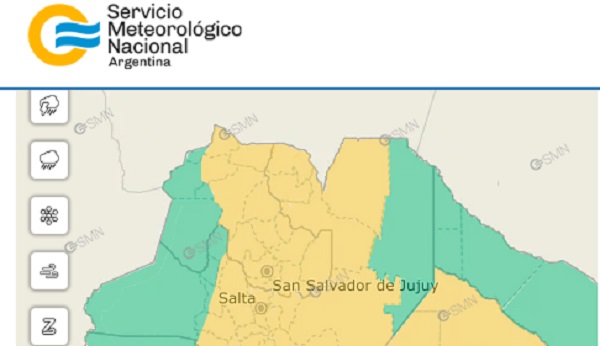 El Servicio Metereológico Nacional (SMN) emitió este jueves un alerta amarillo en un amplio sector de Jujuy. La alerta se extiende hasta el viernes por la mañana. Según la información hay entre un 40% y un 70% de probabilidad de tormentas fuertes para la tarde noche del jueves.