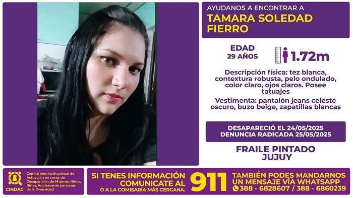 Se trata de Tamara Soledad Fierro, de 29 años, quien se ausentó de su domicilio en Fraile Pintado desde el sábado 24 de mayo. El Comité Interinstitucional de Actuación en Casos de Desaparición de Mujeres, Niñas y Personas de la Diversidad (CINDAC) pide colaboración a la comunidad para dar con su paradero.