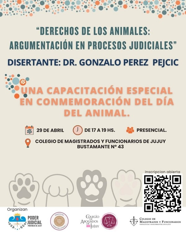 La actividad organizada de manera conjunta por el Poder Judicial de la provincia, el Instituto de Derecho Animal del Colegio de Abogados y Procuradores, el Colegio de Magistrados y Funcionarios de Jujuy y el Colegio de Abogados y Procuradores de la provincia, se concretará de 17:00 a 19:00 horas, de manera presencial, en la sede del Colegio de Magistrados y Funcionarios de Jujuy, ubicada en calle Bustamante Nº 43.