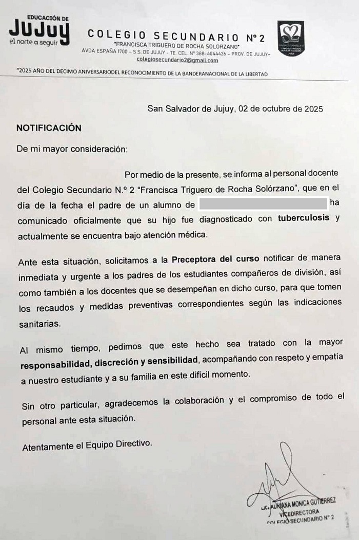 La vicedirectora del Colegio Secundario N° 2 "Francisca Triguero de Rocha Solozarno" informó, a través de una nota escrita, a las autoridades correspondientes que el 2 de octubre pasado el padre un alumno comunicó oficialmente que "su hijo fue diagnosticado con tuberculosis y que actualmente se encuentra bajo atención médica".