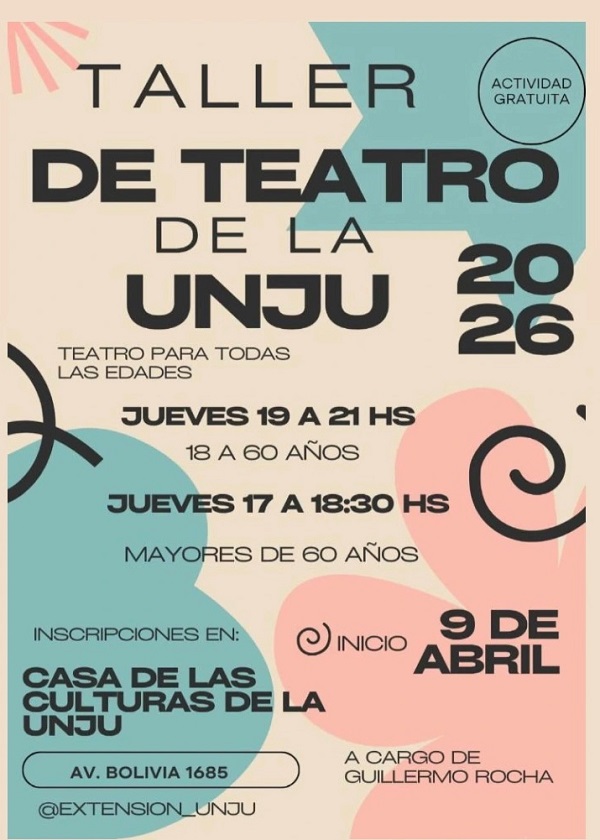 El taller de Teatro de la Universidad Nacional de Jujuy, dirigido por Guillermo Rocha, iniciará sus actividades el 9 de abril, en la Casa de las Culturas de la UNJu ubicada en avenida Bolivia 1685.