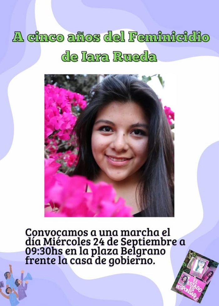 A cinco años del femicidio de Iara Rueda, convocan a una marcha para este miércoles 24 de septiembre en horas de la mañana en los alrededores de la Casa de Gobierno. Por la tarde, se celebrará una misa en la Parroquia San Cayetano en memoria de la joven.