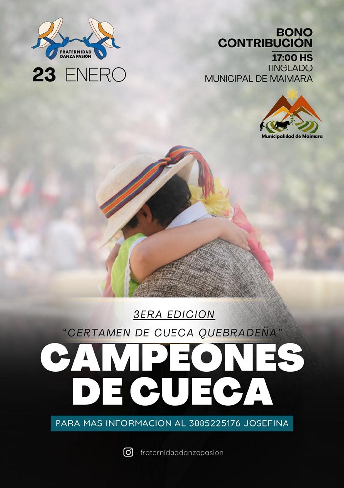 La Fraternidad Danza y Pasión y la municipalidad de Maimará invitan a la comunidad a participar de la tercera edición del certamen “Campeones de Cueca”, que se realizará el 23 de enero, desde las 17 horas, en el tinglado municipal de la localidad.