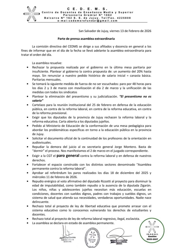 A través de un comunicado de prensa la Comisión Directiva del Centro de Docentes de Enseñanza Media y Superior (CEDEMS) anunció un paro de 48 horas en los establecimientos secundarios de Jujuy para los días 2 y 3 de marzo. En asamblea los docentes del nivel medio decidieron rechazar la oferta salarial del gobierno de la provincia.