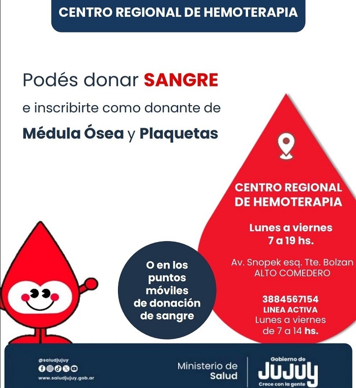 Hay que recordar a los vecinos que pueden acercarse a donar sangre en Av. Snopek esquina Tte. Bolzán, Alto Comedero, de lunes a viernes de 7 a 14 hs. y sábados de 8 a 13 horas.