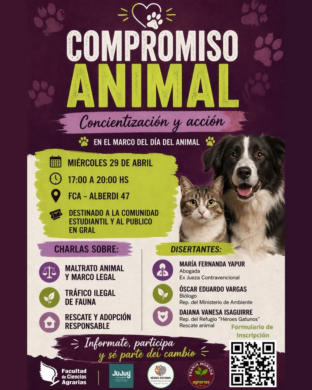 Este miércoles 29 de abril, de 17:00 a 20:00, se realizará la jornada “Compromiso animal: concientización y acción” en el Salón Hansen de la Facultad de Ciencias Agrarias, ubicado en Alberdi 47. La propuesta está destinada a la comunidad estudiantil y al público en general.