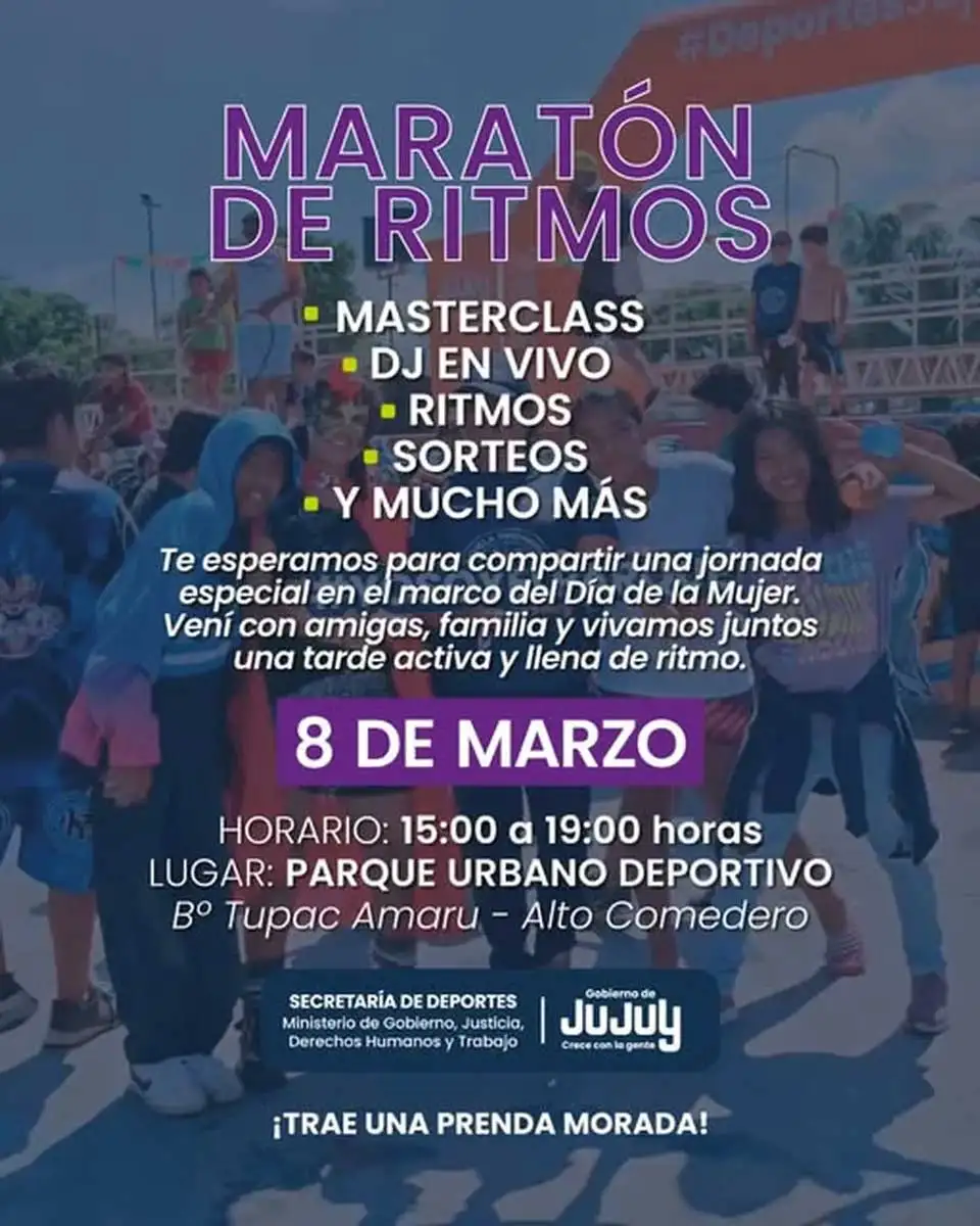 La actividad se realizará el día 8 de marzo 2026, de 15 a 19 horas en el Parque Urbano Deportivo, donde profesores invitados brindaran clases de distintos ritmos. Además, contaran con Dj en vivo, masterclass y sorteos.