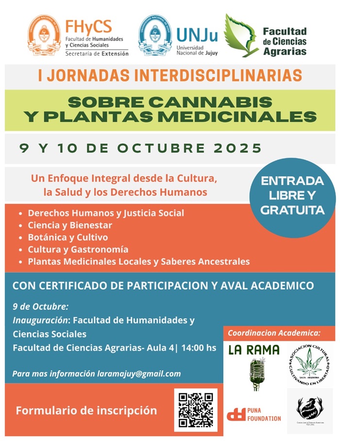 Con el objetivo de abrir un espacio de dialogo académico y comunitario para abordar la complejidad de las plantas con propiedades terapéuticas y sociales, se realizarán los días 9 y 10 de octubre las Jornadas Interdisciplinarias sobre Cannabis y Plantas Medicinales: Un Enfoque integral desde la cultura, la salud y derechos humanos.