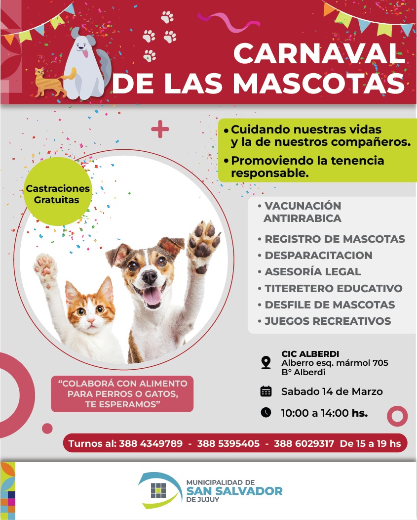 La Municipalidad de Jujuy organizo una nueva edición del Carnaval de Mascotas, una propuesta educativa, recreativa y solidaria pensada para disfrutar en familia junto a los animales de compañía. La actividad se llevará a cabo el sábado 14 de marzo, de 10 a 14 horas, en el CIC Alberdi, ubicado en Alberdi esquina Mármol 705.