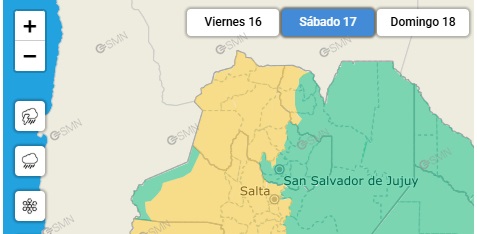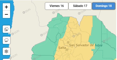 El Servicio Metereológico Nacional lanzó un alerta amarillo por tormentas para hoy 16 de enero y se extenderá todo el fin de semana en distintas localdades de la provincia de Jujuy. Según la información hay un 70% de probabilidad de tormentas aisladas para la tarde -noche del viernes, mientras que para el sábado y domingo las probabilidades rondarán entre un 40% y un 70%. La temperatura máxima llegara a los 28°C y la mínima será de 18°C .