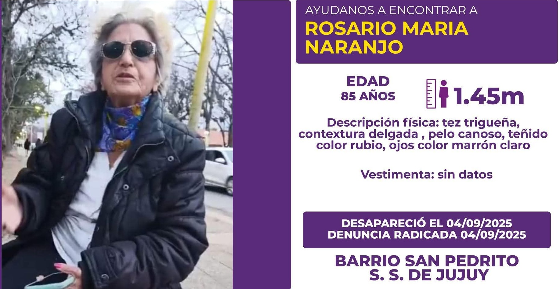 Se trata de Rosario María Naranjo, de 85 años, quien se ausentó de su domicilio en Barrio San Pedrito en San Salvador de Jujuy el jueves 4 de setiembre. El Comité Interinstitucional de Actuación en Casos de Desaparición de Mujeres, Niñas y Personas de la Diversidad (CINDAC) pide colaboración a la comunidad para dar con su paradero.