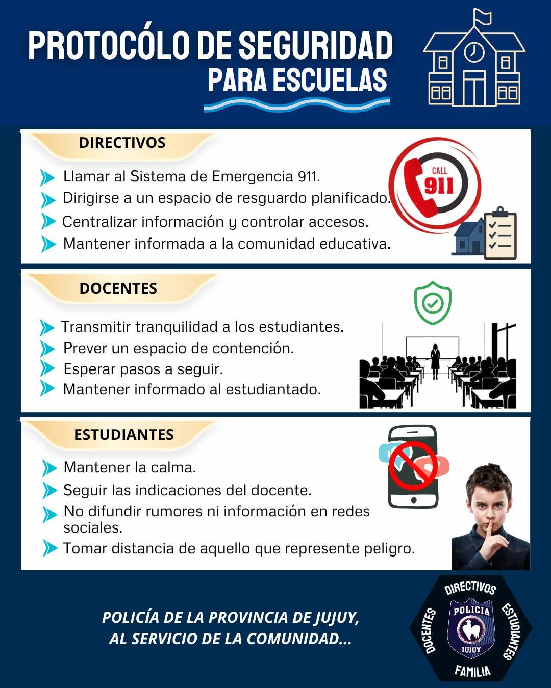 Tras los recientes casos de amenazas en Instituciones Educativas, la Policía de la Provincia de Jujuy difundió un protocolo de seguridad, que permite actuar con mayor eficacia ante este tipo de situaciones.