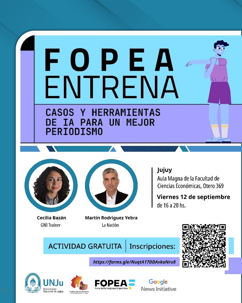 FOPEA Entrena llega a Jujuy el viernes 12 de septiembre y realizará una capacitación sobre periodismo e inteligencia artificial. La actividad tendrá lugar en el Aula Magna de la Facultad de Ciencias Económicas - UNJu, Otero 369, de 16 a 20 horas y estará a cargo de Martín Rodríguez Yebra (La Nación) y Cecilia Bazán (GNI Trainer). Se trata de una actividad abierta y gratuita, pero requiere inscripción previa.