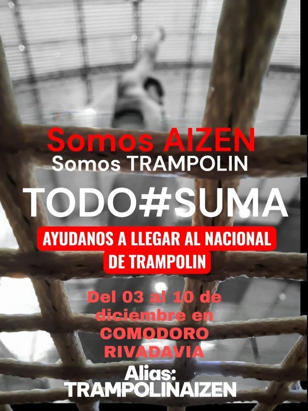 Una delegación de jóvenes atletas de gimnasia de trampolín del Gimnasio AIZEN estarán participando del 3 al 10 de diciembre en la ciudad de Comodoro Rivadavia en el Torneo Nacional de Gimnasia de Trampolín, por lo que están solicitando colaboración para costear los gastos del viaje.