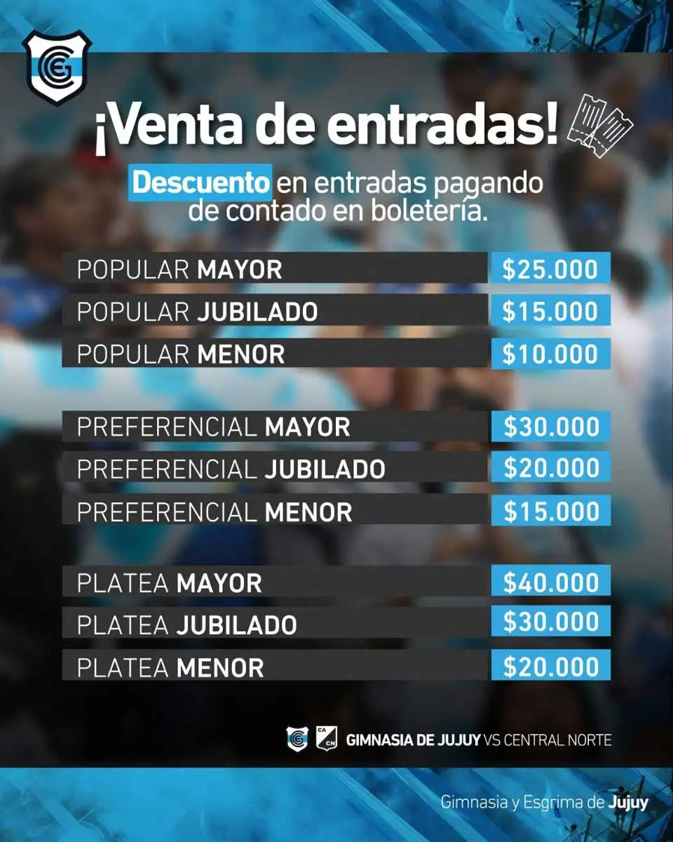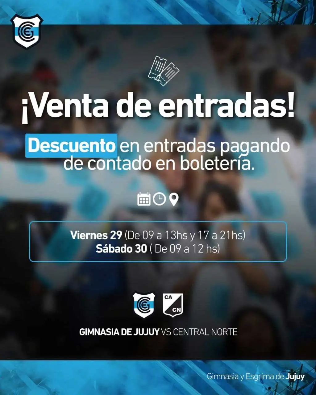 Mañana viernes se pondrá en marcha la venta de entradas físicas para presenciar el partido que disputarán Gimnasia y Esgrima de Jujuy y Central Norte de Salta, por la fecha 29 de la Primera Nacional Zona B.