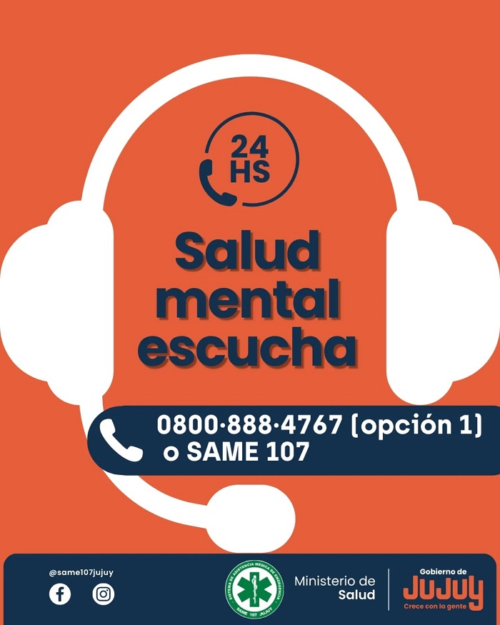 En Jujuy, el Ministerio de Salud reitera a la comunidad la disponibilidad 24 horas de SAME Salud Mental que integra la red de numerosos servicios públicos y gratuitos en Salud Mental y al que se puede acceder llamando al 107 o al 0800 888 4767.