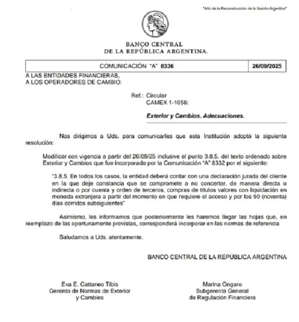 El gobierno nacional volvió a restringir operaciones cambiarias: quienes compren dólares por el mercado oficial no podrán operar con dólares financieros y viceversa, una medida que reinstala de forma parcial el cepo cambiario, informó el comunicado 8336 del Banco Central con fecha 26 de septiembre.