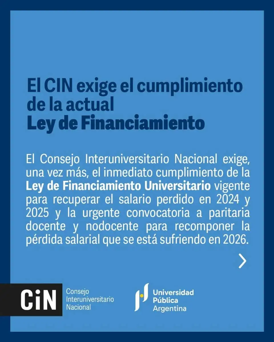 El Consejo Interuniversitario Nacional (CIN), que nuclea a los rectores de las universidades públicas del país, emitió un comunicado a través del cual exigió el "inmediato cumplimiento de la Ley de Financiamiento Universitario vigente para recuperar el salario perdido en 2024 y 2025 y la urgente convocatoria a paritaria docente y no docente para recomponer la pérdida salarial que se está sufriendo en 2026".