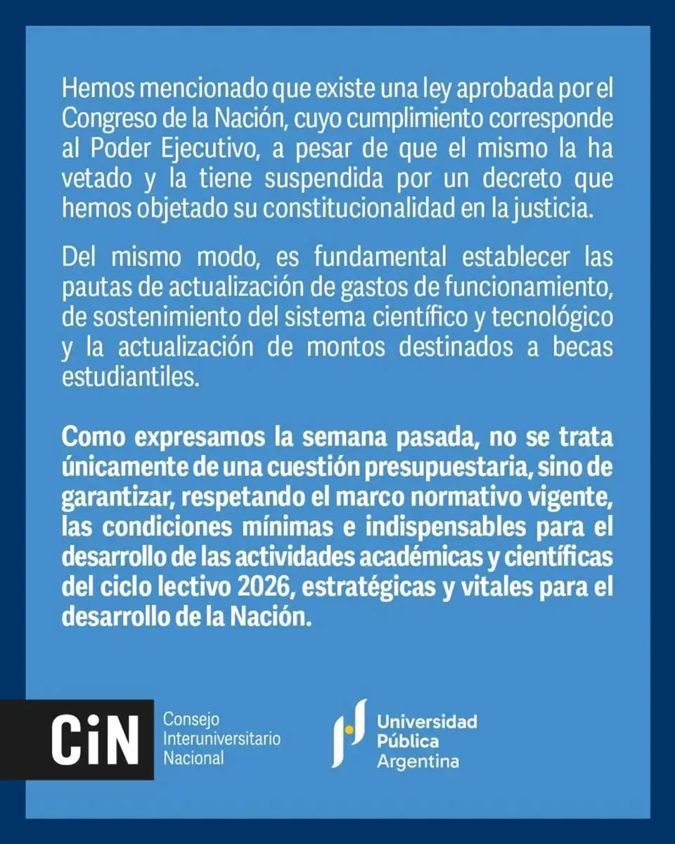 Como expresamos la semana pasada, no se trata únicamente de una cuestión presupuestaria, sino de garantizar, respetando el marco normativo vigente, las condiciones mínimas e indispensables para el desarrollo de las actividades académicas y científicas del ciclo lectivo 2026, estratégicas y vitales para el desarrollo de la Nación.