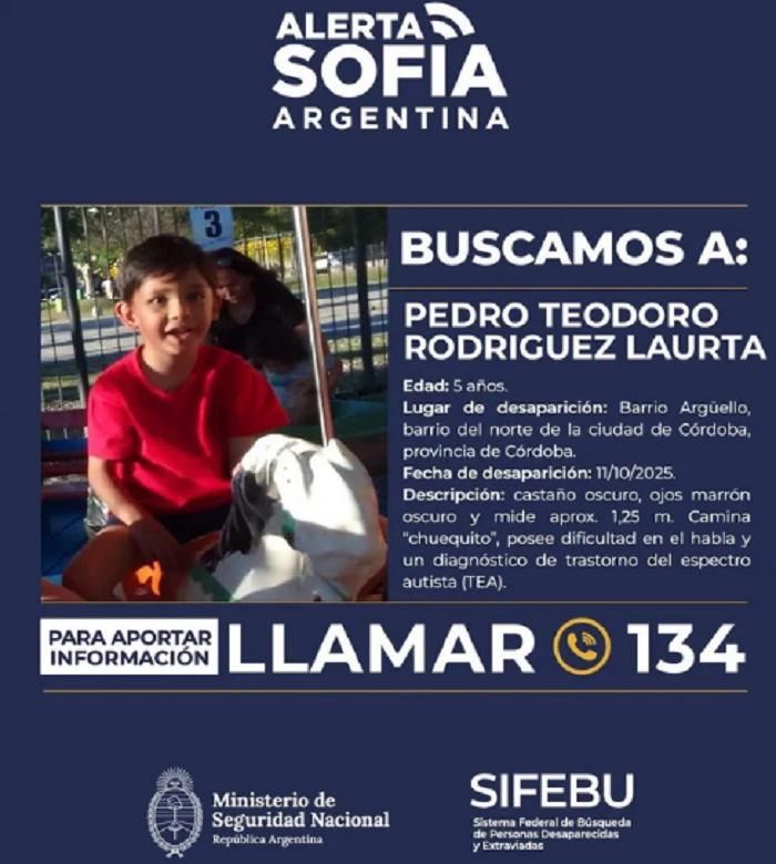 El Ministerio Público Fiscal de la provincia de Córdoba informó que fue encontrado en Gualeguaychú, Entre Ríos, el niño Pedro Rodríguez Laurta de 5 años que había sido sustraído por su padre. El niño está en buen estado.