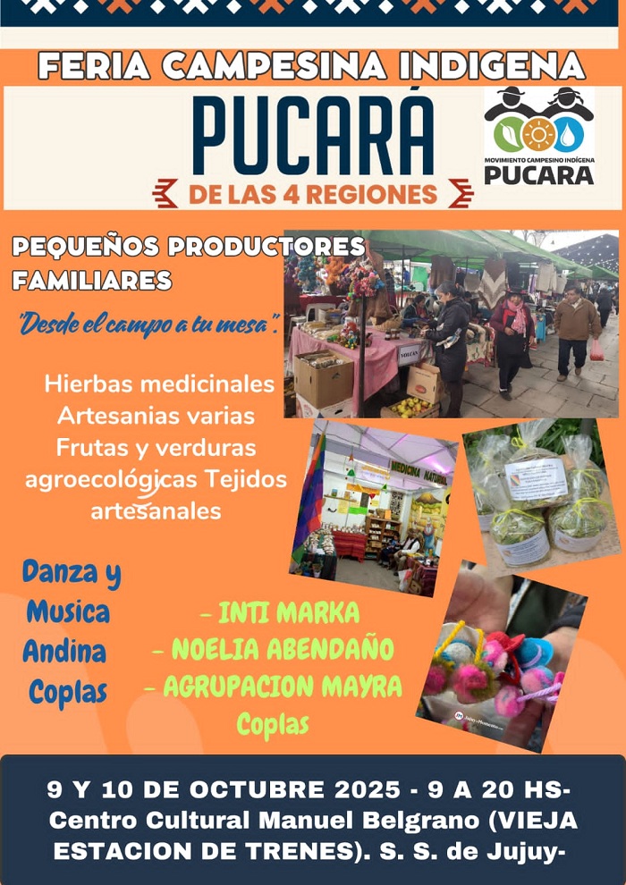 La tradicional Feria Campesina Pucará vuelve a San Salvador de Jujuy de la mano de productores de la agricultura familiar, tejedores, emprendedores gastronómicos y artesanos de distintas localidades de la provincia. Además los visitantes podrán disfrutar de danzas, música y coplas.