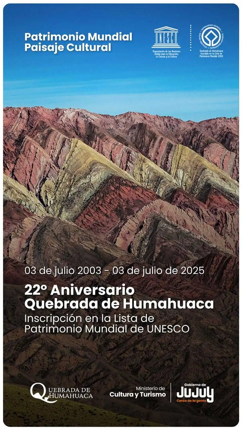 En este nuevo aniversario, el ministro de Cultura y Turismo de Jujuy, Federico Posadas, expresó: “Hoy celebramos con orgullo el 22.º aniversario de la declaración de la Quebrada de Humahuaca como Patrimonio Mundial por la UNESCO. Este reconocimiento internacional subraya no sólo la impresionante geografía del valle, sino el legado vivo de los pueblos originarios que, con tradiciones, lenguas, ritos y técnicas agrícolas, han mantenido su identidad ancestral.”