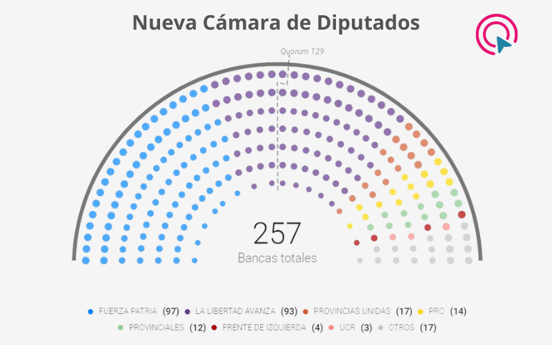 De este modo, en Diputados La Libertad Avanza pasó de tener 37 a quedar con 93 bancas teniendo en cuenta a los aliados de otras fuerzas, a partir del 10 de diciembre. El oficialismo había puesto en juego tan solo ocho lugares y obtuvieron 64, lo que deja como saldo una ganancia de 56 escaños. Fuerza Patria continúa siendo el espacio con más bancas en su poder, ya que tendrán 99 en la nueva cámara. Sin embargo, restaron cuatro lugares, por el hecho de que habían puesto en juego 48 y obtuvieron 44.