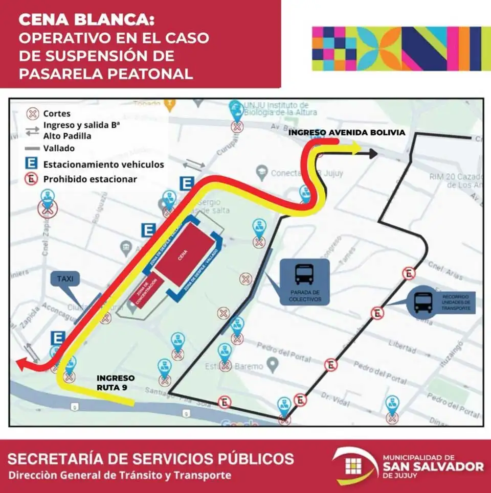 La Municipalidad de San Salvador de Jujuy, a través de la Dirección de Tránsito y Transporte de la Secretaría de Servicios Públicos, informó el operativo especial que se aplicará este sábado 6 de diciembre, con motivo de la realización de la tradicional Cena Blanca en Ciudad Cultural, desde las 18 horas.