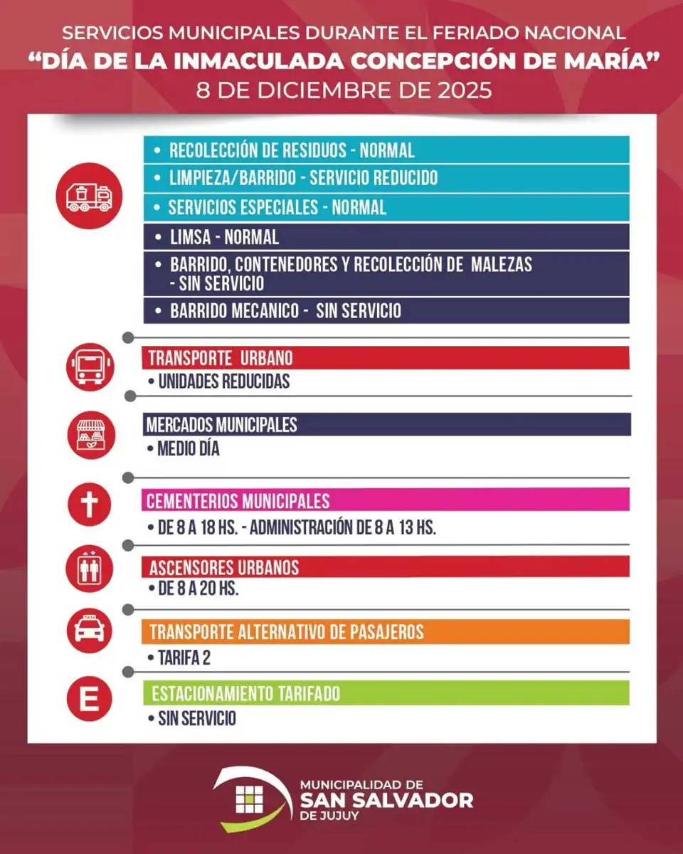 La Municipalidad de San Salvador de Jujuy informó cómo se organizarán los principales servicios durante el feriado nacional por el Día de la Inmaculada Concepción de María, con el objetivo de brindar previsibilidad a vecinos y vecinas durante la jornada.