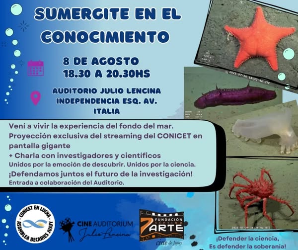 Este viernes 8 de agosto a las 18:30 horas, el Auditorium Julio Lencina abre sus puertas a toda la comunidad para compartir una experiencia científica única con la proyección en pantalla gigante del streaming que realiza el CONICET desde el Cañón Submarino de Mar del Plata, a más de 2.000 metros de profundidad.